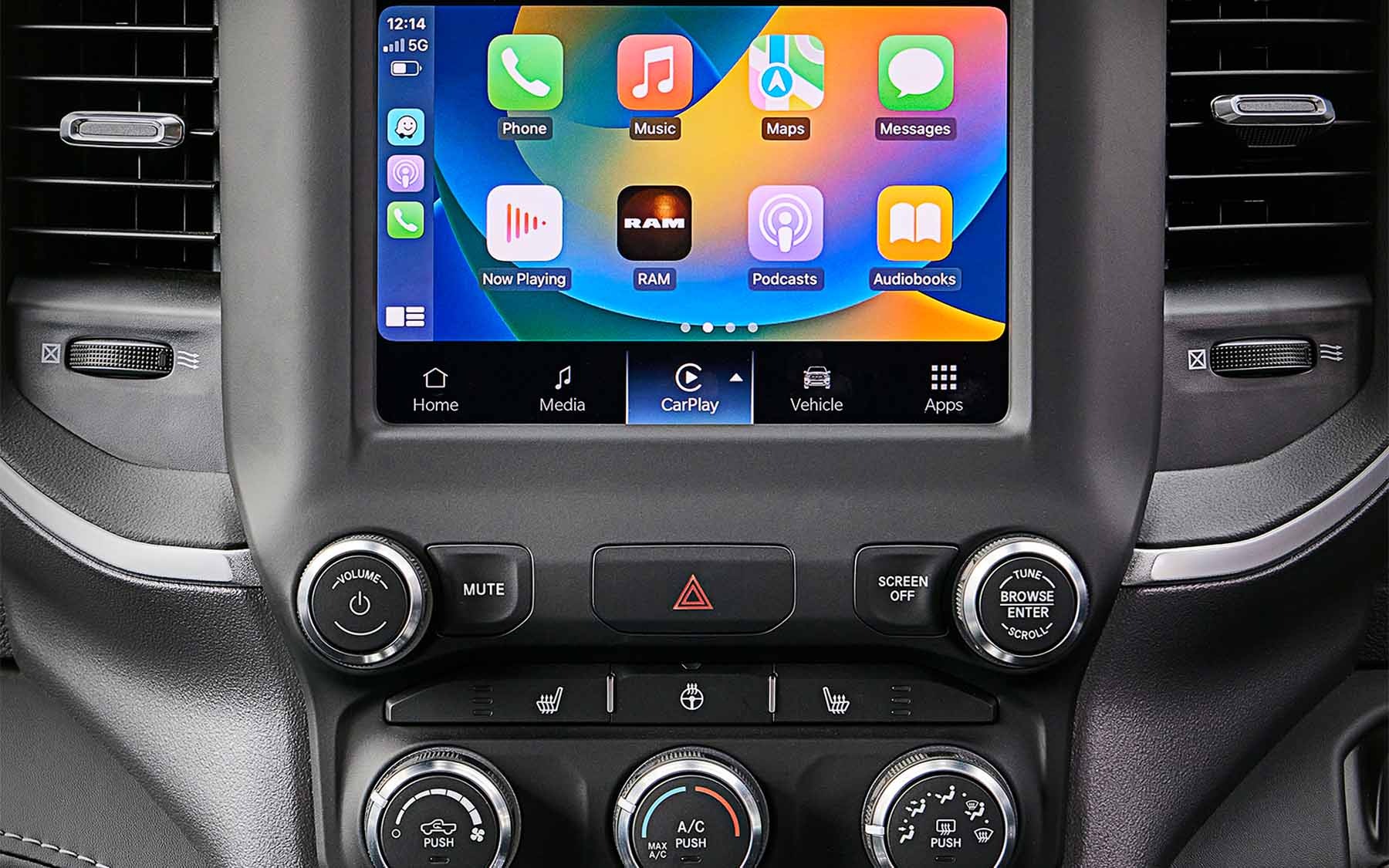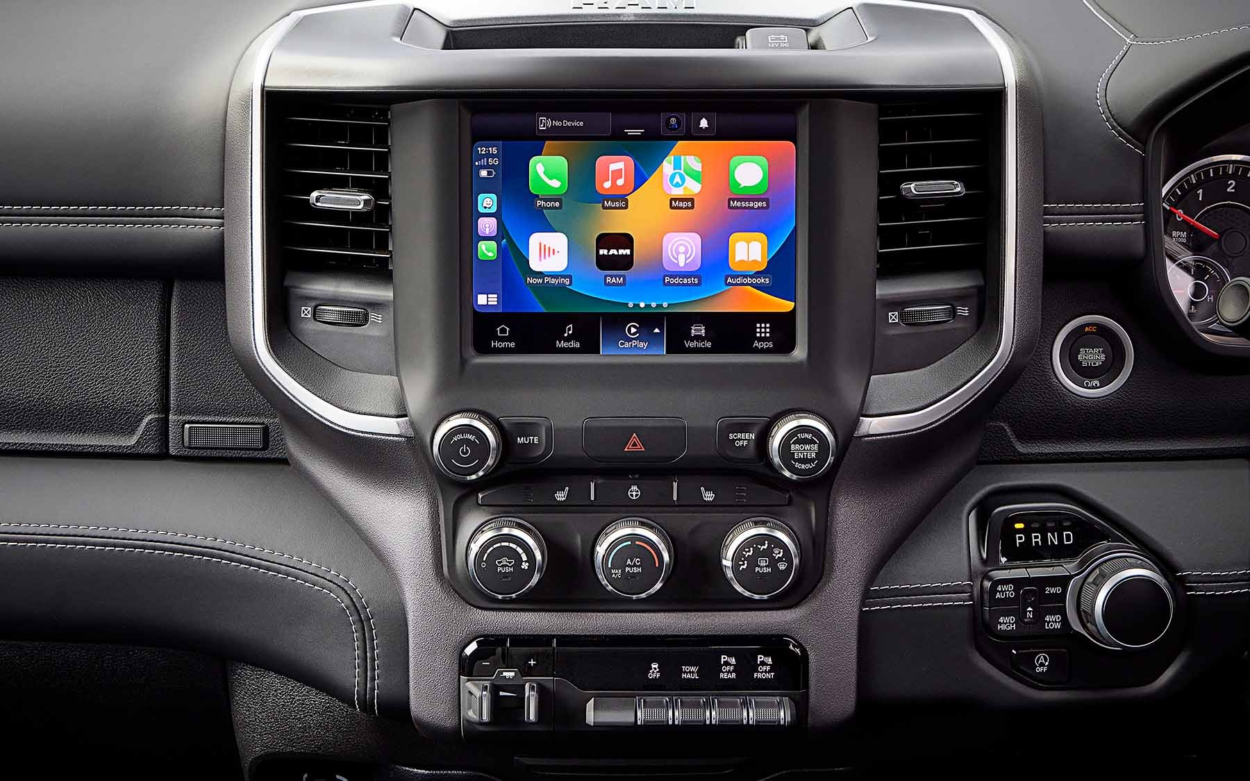 The Ram 1500 Big Horn® is packed with practical tech and useful features. The 8.4" Uconnect touchscreen comes with wireless Apple Carplay™ and Android Auto™ connectivity, as well as convenient steering wheel mounted audio controls. The Big Horn® also features front and rear ParkSense® Park Assist, power and heated door mirrors, electro-chromatic rear view mirror, electric rear sliding cab window and much more.