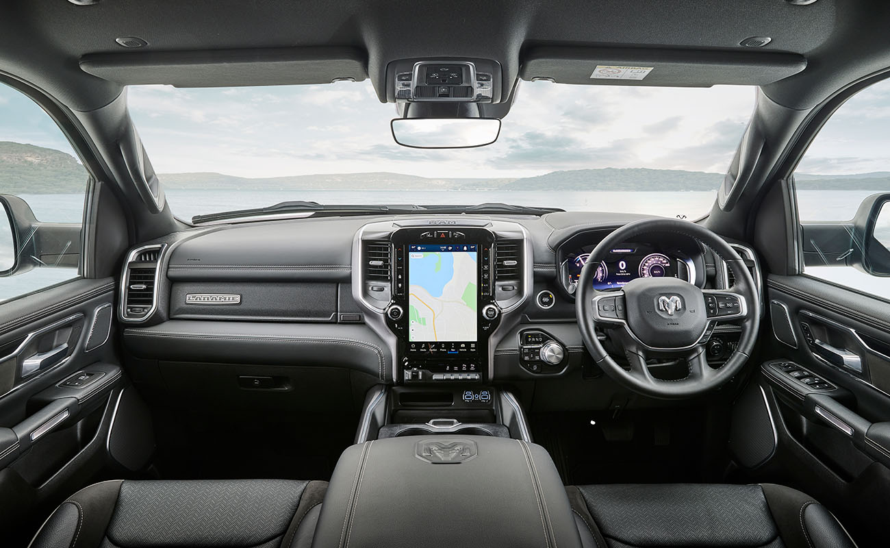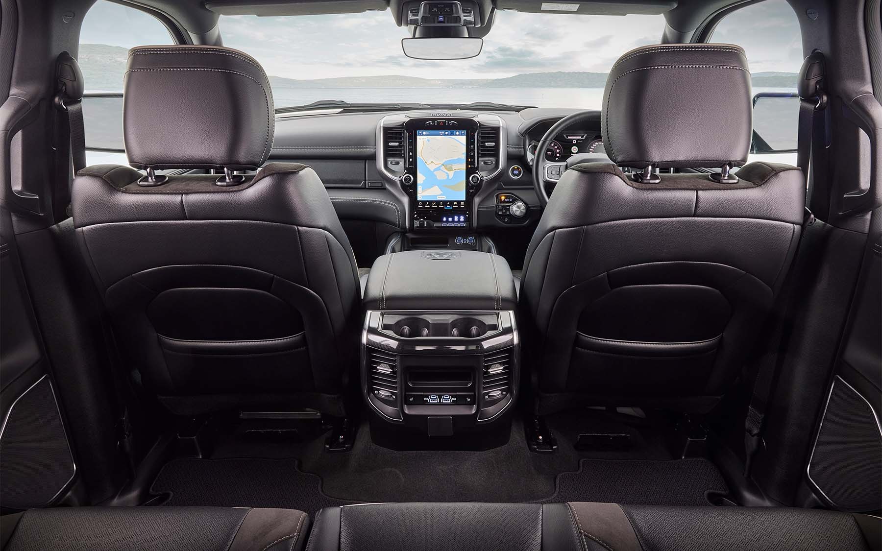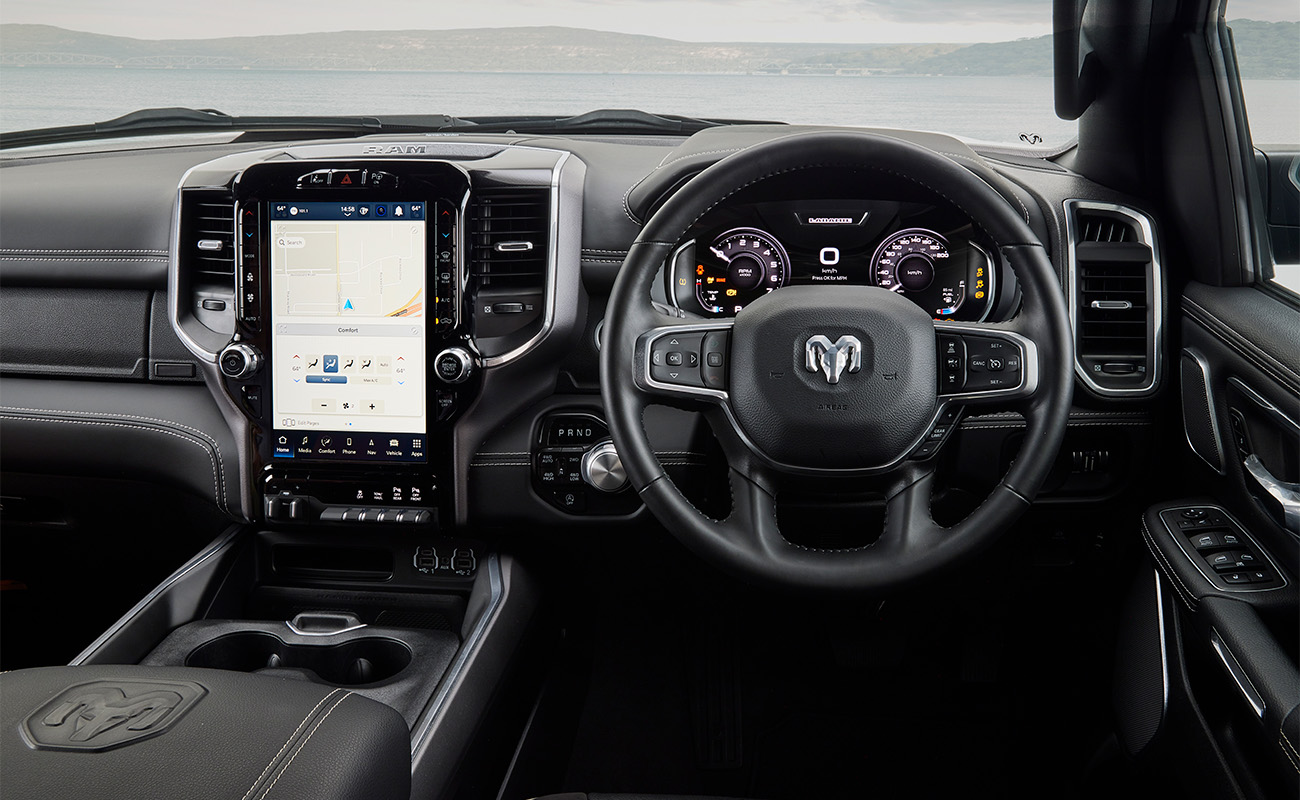 The Ram 1500 Laramie® Sport features a supersized class-exclusive 12-inch fully configurable touchscreen display, keeping infotainment, navigation, and vehicle settings, all at your fingertips. What's more, the driver benefits from a new 12" digital cluster with full-colour 3D graphics and full screen navigation directly within your line of sight. Additionally, with colour-customisation and easy-to-see vehicle stats, this display can help boost your confidence behind the wheel. Inside the cabin, you will experience the most powerful audio system ever available in a pickup truck. The powerful 900-watt Harman Kardon® sound system features a total of 19 speakers* that ensure an unrivalled entertainment experience in the cabin. An active noise cancellation system and acoustic glass reduce ambient sounds to extremely low levels, making this generation 1500 the quietest RAM ever. So quiet in fact, you’ll feel like you’re in a large luxury SUV.